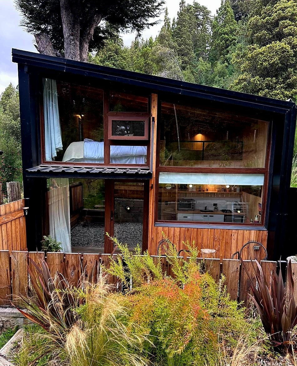 Denne hus-container er indlejret i en skov af cypresser og radarer, med en dejlig have. Området er meget stille, det er et beboelseskvarter, der er omkring 12 blokke fra centrum af Bariloche. De har et lille værelse med dobbeltseng, skab, badeværelse med badekar og køkken integreret i stuen, hvor der er en sovesofa ( det bliver til en 1,30 bred seng). Køkkenet har køleskab under disken, elektrisk ovn med to komfurer, brødrister og vandvarmer.