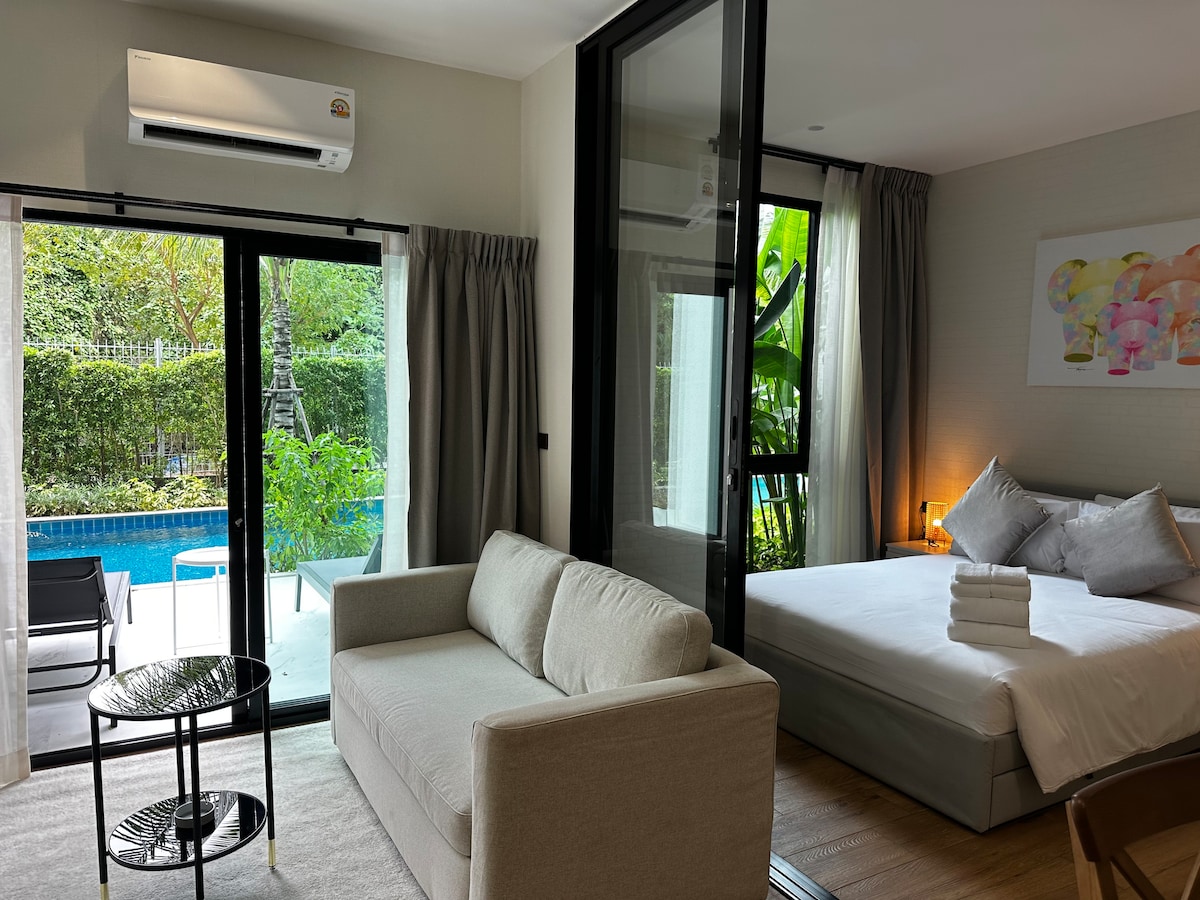 Tag på ferie i denne stilfulde 39 m² store stuelejlighed med 1 soveværelse, egen indgang og direkte adgang til poolen. Slap af på din skyggefulde terrasse kun få skridt fra vandet, eller slap af i det lyse, moderne interiør med en kingsize-seng, smart-tv og fuldt udstyret køkken. Nyd et rummeligt badeværelse med brusekabine, hurtig wi-fi og aircondition. Perfekt til par eller fjernarbejdere, der søger komfort, privatliv og bekvemmelighed i fredelige omgivelser i resortstil nær Naiyang-stranden.