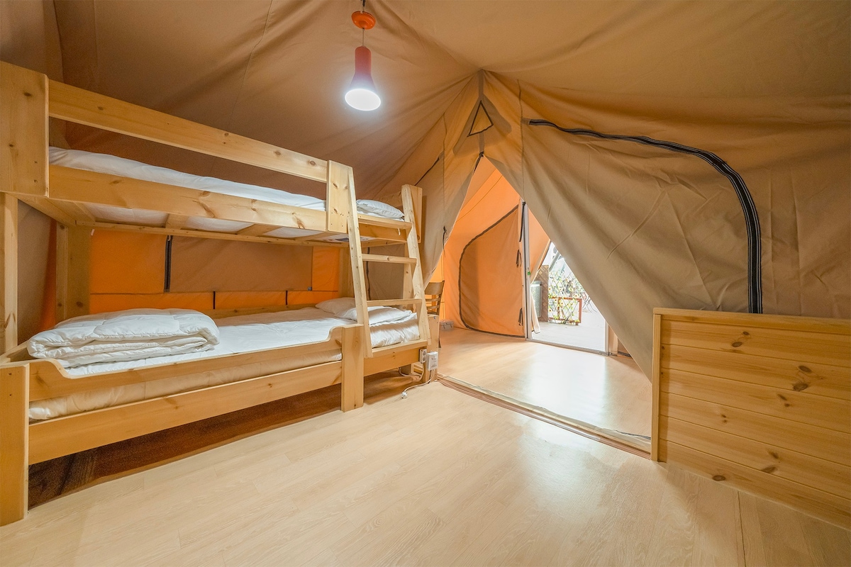 Hej, vi er Onda, der forsker og tilbyder forskellige hvileområder. Jeg håber, at alle, der vil bo her, får en behagelig og glad tid. [Indkvarteringsindledning] Omgivet af en stor privat dal og skov lige foran glampingpladsen kan du se den maleriske udsigt. Det er en starlight nuri glampingplads, der ligger 10 minutter væk i bil fra Morning Calm Arboretum. Hvis du planlægger helbredende og smukke minder i et rent naturmiljø, hvor floden (dalen) og bjergene ved foden af Chungnyeongsan-bjerget i det rene område Gapyeong er det Gapyeong Starlight Nuri Campground. [Værelsestype] Etværelses type (2 dobbeltsenge + 1 toilet) * Sengetøj leveres i henhold til antallet af personer booket.