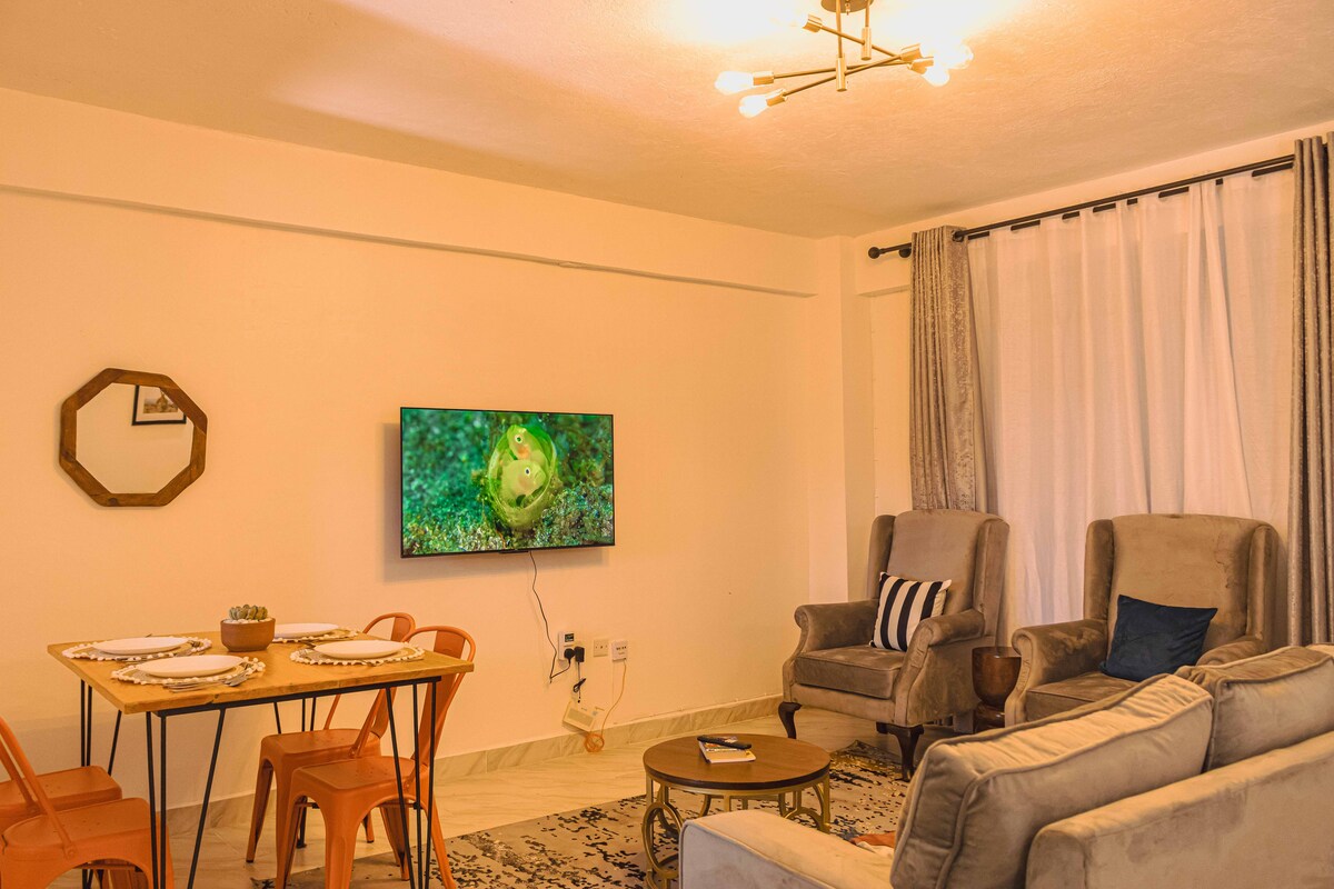 Tag til The Oasis Manor Apartment BnB – et stilfuldt og roligt tilflugtssted med betagende bjergudsigt. Slap af i en hyggelig queensize-seng, nyd et moderne køkken, hurtig Wi-Fi, DSTV og Netflix, eller slap af på din private balkon med morgenkaffe. Det ligger kun få minutter fra Coffee Bench Nanyuki og Cedar Mall og er den perfekte blanding af komfort og eventyr – ideel for par eller solorejsende, der søger ro og bekvemmelighed.