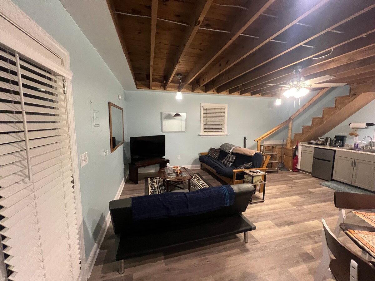 Velkommen, venner! Denne nyligt ombyggede toetagers lade ligger i den dejlige natur og ensomhed i den smukke Sunset Park. Tæt på alt, men gemt væk i et roligt skovområde bag mit hus, kigger du ud af vinduet for at finde parkens åbne grønne område. Tag en spadseretur til steder som City Lake, discgolfbanen, hundeparken, Chico's Mexican Restaurant og meget mere. Du er kun 1,5 km fra Historic Downtown og Rocky Mount Mills campus!