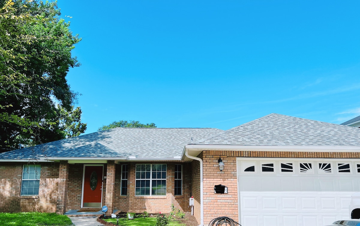 Velkommen til din strandferie! Smukt hus inden for gåafstand (1,5 miles. 1,2 miles er at gå over dæmningen med beskyttede stier på hver side) til det sukkeragtige hvide sand på Navarre Beach, bølger af Navarre-lyden, mange restauranter og meget mere! Faciliteter i massevis! To overdækkede terrasser til afslapning, bålplads til hyggelig aften afslapning og en afskærmet veranda sammen med udendørs belysning. Nyd en cykeltur til stranden eller en lur i hængekøjen i baghaven, når dagen er omme. Plads til 6 personer.