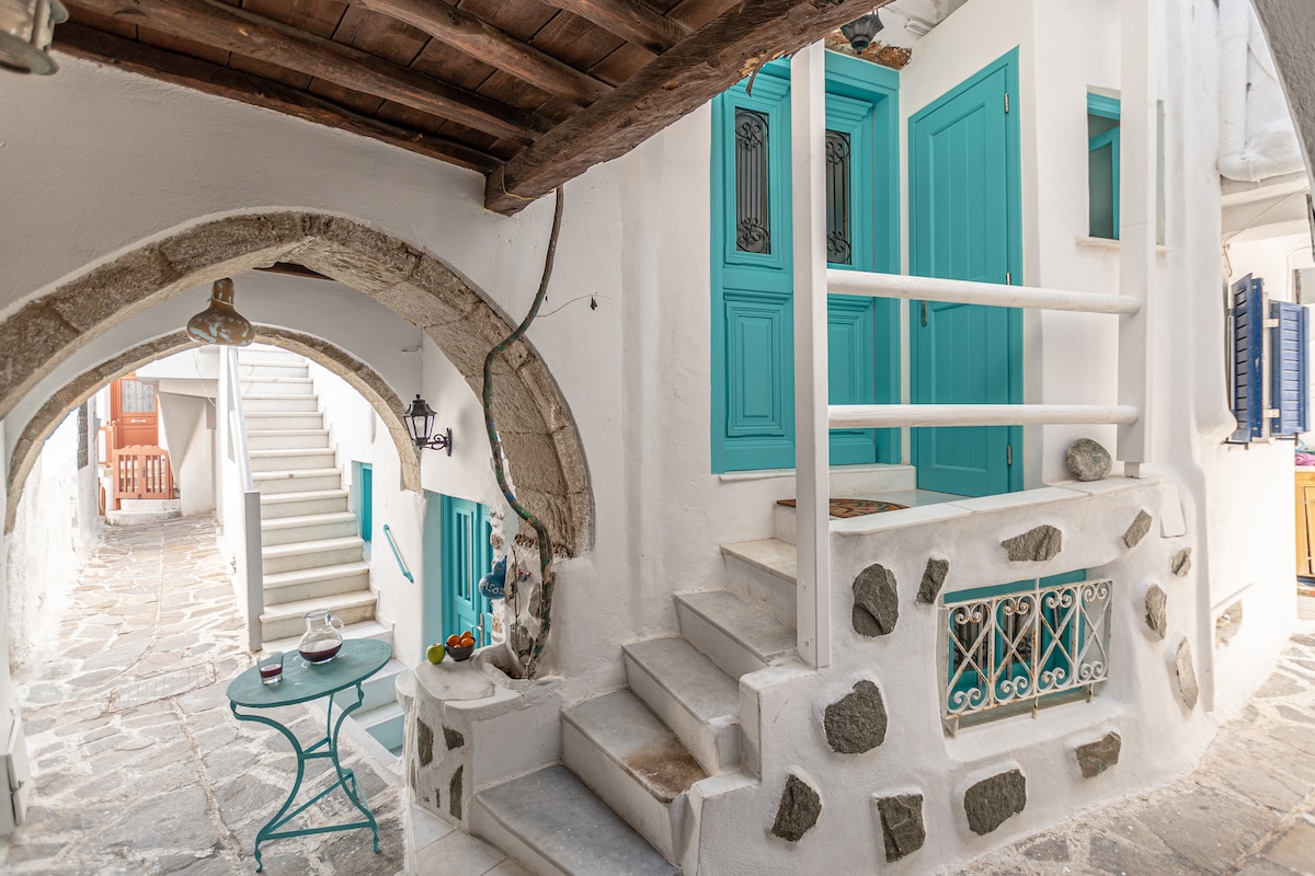 Built around the Cycladic arches called Camares, almost at the entrance of the Castle the studio is located in a well-known neighborhood that combines both the privacy and the vibrant life of restaurants wine bars and every kind of store. The studio features a king size bed, a sofa bed for 2, a kitchenette and a private bathroom as well as a private terrace overlooking the sea and the busy streets. The harbor, the beach and two public parking lots are also very close to the apartment.