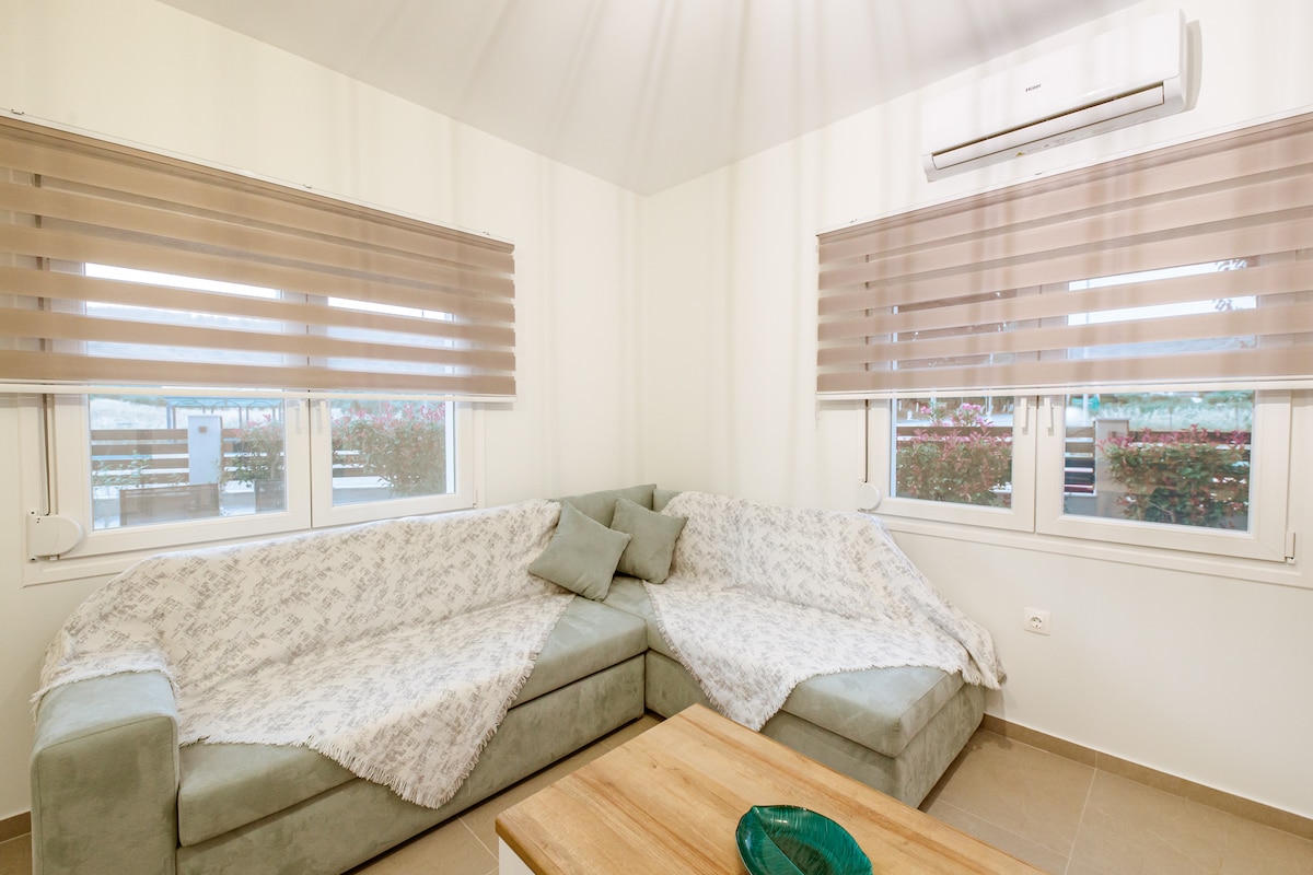 A fully renovated luxurious apartment in Nea Skioni, located in a quiet place, 200m from beach and 150m from restaurants, supermarkets and shops. Consists of 1 bedroom with queen size bed with his own AC, a bathroom ,a fully equipped kitchen with all electric appliances and cooking utensils, and a cosy living room with a sofa that turns to a queen size sofa bed, AC and satellite TV with Netflix. The apartment also have a private outdoor yard with dining table, BBQ and a outdoor furniture set.