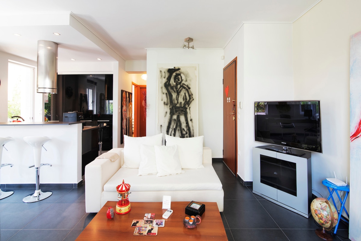 This exquisite apartment is located at Valaoritou street in Agia Paraskevi, one of the most beautiful areas of the southern suburbs of Athens that has a lot of green areas, quietness and safety. Its privileged position offers easy access to Attica Tollway (only 800 m away from junction Y3) and a convenient parking space. In order to go to the center of Athens, visitors will need approximately 11 minutes, as the metro station is only 90 m away from the (URL HIDDEN) neighborhood has a lot of parks, restaurants,cofee shops,gym and a big super market near byThe whole building, the interior of the apartment and the exterior balkony area are constructed in a way, so that the house is functional and tasteful. Its equipment and furniture are selected with a focus on modern and minimal style. The apartment is arranged so that it can accommodate a couple or a family with (2) children. In the main area, there is a living room with a corner couch that is easily transformed into a bed, situated in front of the fireplace that creates a warm and cozy atmosphere in the cold winter nights. The kitchen is fully equipped with all necessary kitchenware and has a spacious refrigerator, a washing machine and an electric oven. The bedroom has a queen-size bed. When you open the main French window of the living room, you step out in a beautiful balkony with a lot of plants where you can enjoy a coffee, lunch or dinner with the company of friends