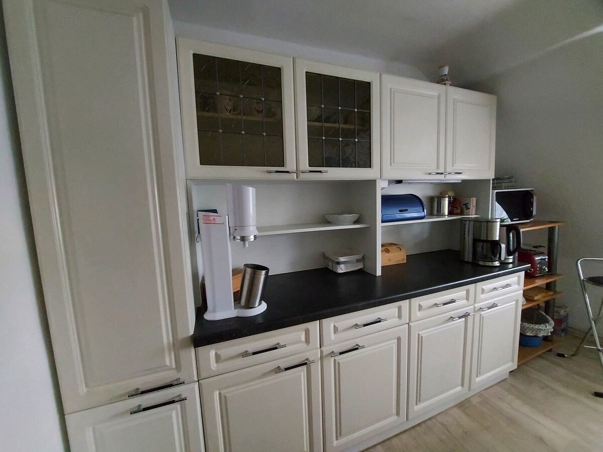 2-værelses ikkerygerlejligheden (55 m2), egen indgang til øverste etage i vores fritliggende hus med køkken og badeværelse er fuldt møbleret. Der er plads til op til 3 personer, en springmadras, sovesofa i stuen. Håndklæder +sengetøj er inkl. For shopping er Rewe, Netto, LIDL i umiddelbar nærhed. Fra Birkenstein S-Bahn-stationen kan du nå Berlin-Mitte på 30 minutter. Bilen kan parkeres gratis på ejendommen.