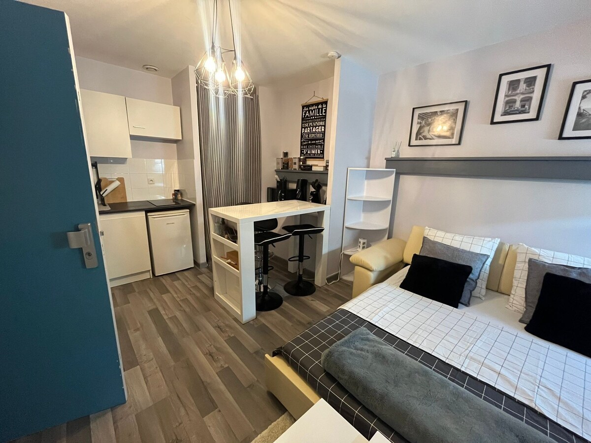 Stille studiolejlighed, der ligger midt i den smukke by Sézanne, tæt på butikker og aktiviteter: caféer, butikker, besøg, udstillinger, sport. Plads til 2 voksne + 1 lille barn. Der er dyne, puder, tæpper, sengetøj og badetøj. etværelses på 2. sal uden elevator. Opdelt trappe uden rampe, vanskelig for personer med mobilitetsvanskeligheder. FIBERINTERNETFORBINDELSE – 3 m ethernet-kabel til rådighed + WIFI + TV-KANALER