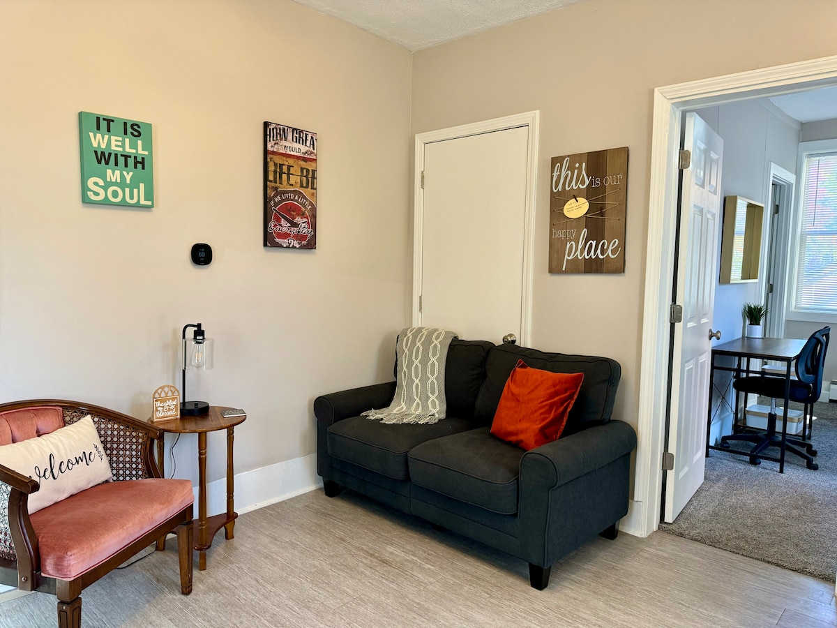 Privat gæstehus, der er nyrenoveret. Et soveværelse med queensize-seng, badeværelse med bruser, fuldt udstyret køkken, herunder mikrobølgeovn og Keurig-kaffemaskinepuder inkluderet, familieværelse, tv og Wi-Fi. Uanset om du er i byen for at arbejde, sportsstævne, familie eller bare på ferie, tilbyder vi alle hjemmets bekvemmeligheder. Luftmadras kan rekvireres på anmodning. Behandl det som dit eget hjem, følg alle husregler. Ingen fest eller sammenkomster. Dette er et røgfrit hjem.