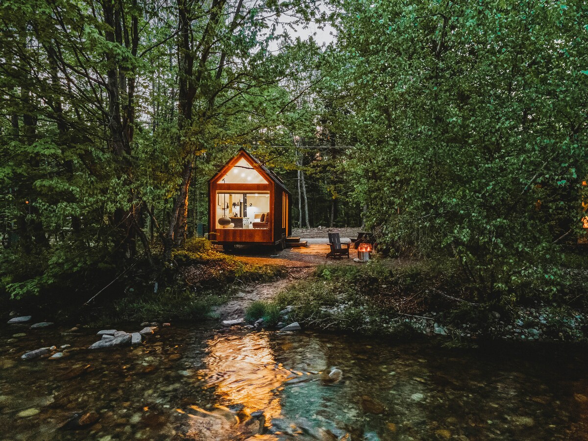 Denne lille træhytte ligger lige i Campton Village. Det er rent og meget lyst og muntert takket være gulv-til-loft-vinduet, der har udsigt over Mad River. Omfatter et LILLE tekøkken (anbefales ikke til dem, der tager madlavning alvorligt) og et aflåst udendørs opbevaringsrum til ski og udendørs udstyr. Lille spabad til 2 personer. WiFi. Niveau 2 EV-oplader på stedet (ekstra gebyrer gælder). 5 min gang fra et håndværksbryggeri, købmand, en vintage arkade og slikbutik.