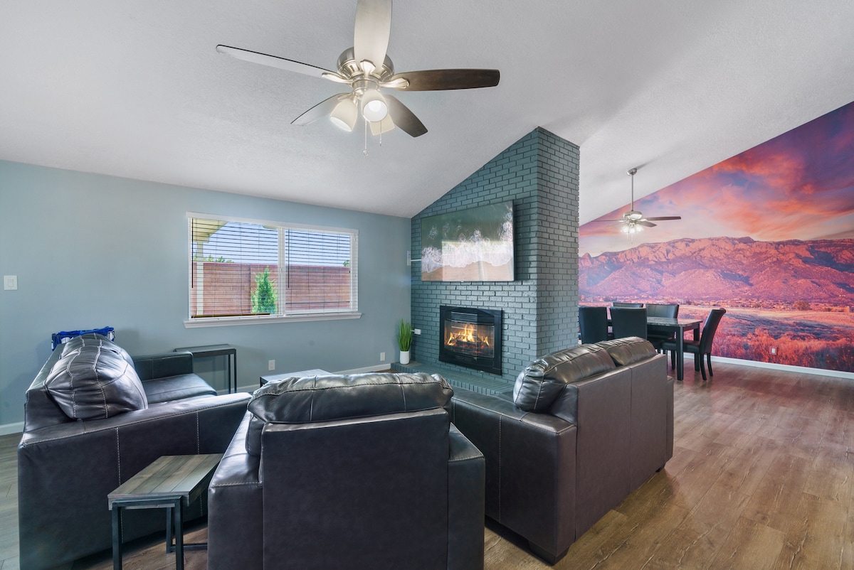 Nyrenoveret bolig beliggende i højderne i Albuquerque er den perfekte familieferie! Med plads til op til 10 personer kan denne bolig prale af 3 kingsize-senge og queensovesofa, 4 streaming-tv'er, komplet køkken, vaskemaskine/tørretumbler, boblebad, bordfodboldbord og brætspil. Rejser du i forbindelse med arbejde? Vi dækker dig med et privat kontor, adgang til to garager og et komfortabelt udendørs område. Beliggende kun få minutter fra motorvejen, tæt på restauranter, fitnesscentre, dagligvarebutikker og parker. Tag familie og venner med.
