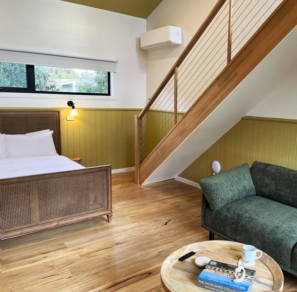 Light, bright and spacious. From the moment you walk in you'll feel calm and relaxed. Fire up the wood fire or simply press a button for instant warmth or cool. Comfy Koala mattresses on beds also equipped with electric blankets. Clean, white stone bench tops and a large cooktop and oven if eating-in is your plan. Stylish and comfortable living spaces. Streamlined bathroom and ensuite, each with a large glass-walled shower. Enjoy the grassy front deck area or sit around the fire pit at the back.