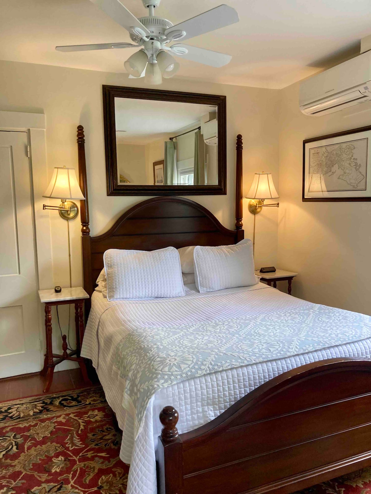 Soveværelse med 2 queensize-senge og privat badeværelse med udsigt over Themsen St. Dette er et meget charmerende værelse i hjertet af Newport Downtown. Du er få skridt fra pubber som Brick Alley Pub og på den anden side af gaden fra Irish Pub, få skridt fra restauranter som The Mooring, The Black Pear, 22 Bowen's og meget mere, du vælger! Tæt på barer, arkade, is og Newport Shipyard. Gå to minutter, og du er i Perrotti-parken og venter på færgeturene rundt på øen. Værelse på anden sal, ingen elevator.
