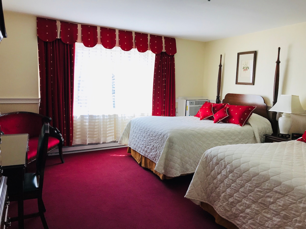 Dette rum er et unikt og alsidigt rum med en queensize-dobbeltseng og en dobbeltseng i en effektivitetsindretning. Der er to fjernsyn, et badeværelse med brusebad, antik bondegårdsvask og en privat terrassedør, der fører til en fælles balkon, hvor du kan nyde den friske luft. *Dette værelse tillader 1 kæledyr under 18 kg med værtens godkendelse – Der er et kæledyrsgebyr på 50 dollars* *Denne enhed ligger på 3. sal. Der er ingen elevator.*