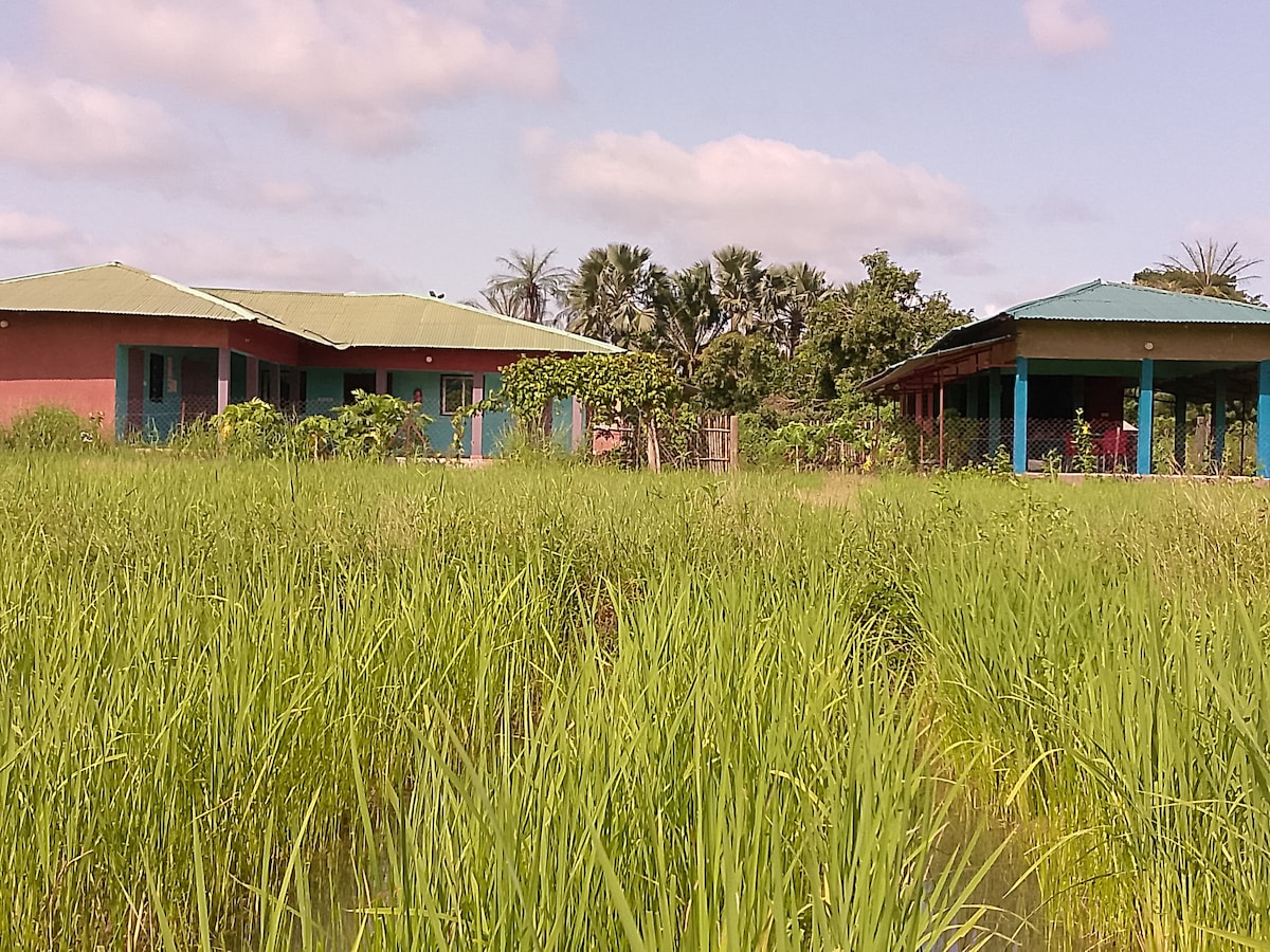 Tæt på rismarker og 1 km fra centrum af Oussouye Hvert dobbeltværelse har sit eget brusebad (varmt vand), toilet og håndvask Stue/køkken Terrasse, have, privat parkering, afslapningsområde under stråhytte Vaskemaskine, køleskab, komfur, grill, mikrobølgeovn, brødrister, hårtørrer, ventilatorer ... Mulighed for at låne bøger, tegneserier, brætspil, petanque-bolde Mange udflugter i det omkringliggende område: vandring, cykling, kanosejling, fiskeri, paddleboarding ... Morgenmad efter anmodning.