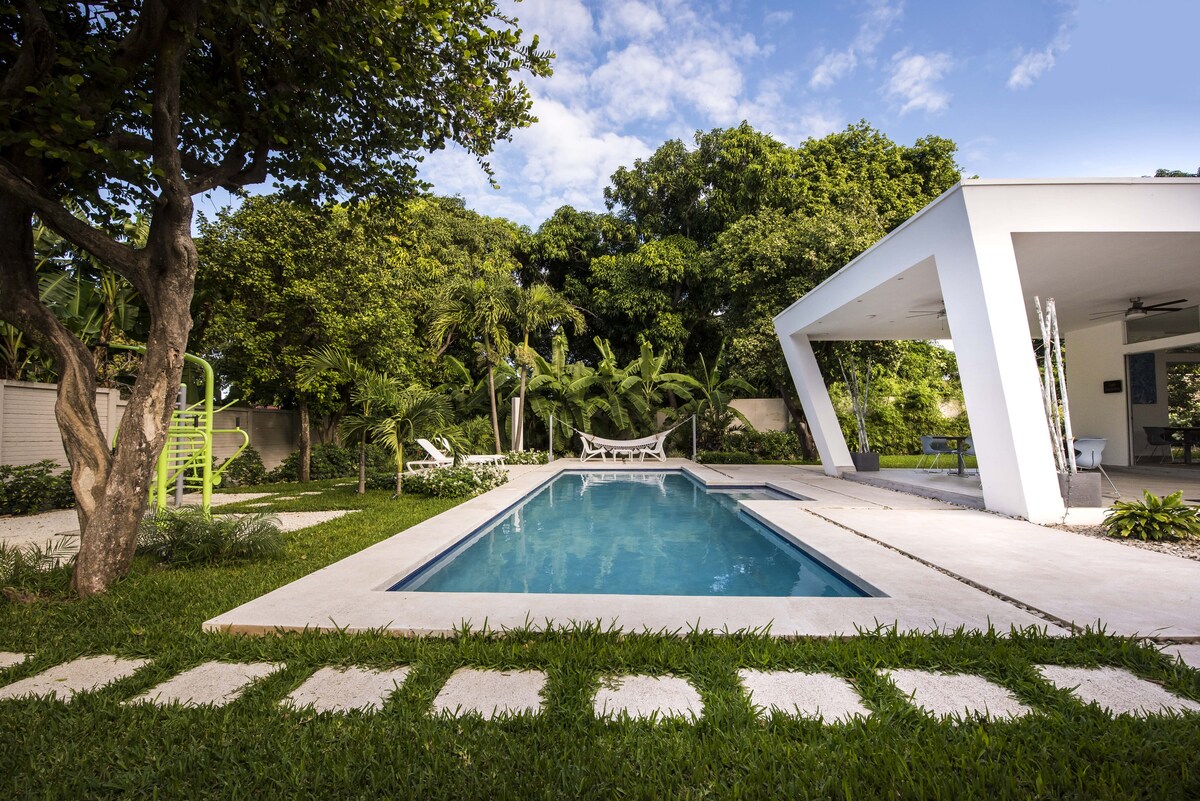Smukt værelse med haveudsigt og pool