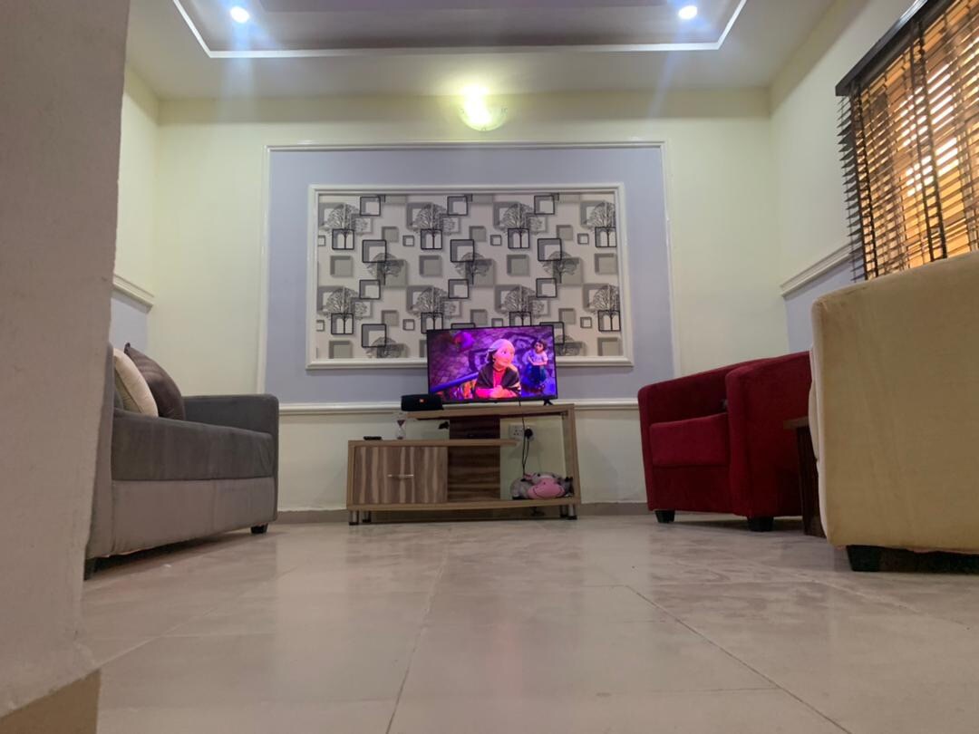 -24/7 Electricity-( AEDC/INVERTER/GEN) - Fuldt udstyret tekøkken. - Møbleret stue - Møbleret soveværelse - 1 aircondition - Nærhed til supermarkeder, skoler og restauranter. - Rent og frisk sengetøj og håndklæder - Fremragende kundeservice og support. - Regelmæssig rengøring - roligt, sikkert og smukt nabolag. 43'' Smart TV (DSTV, Netflix) Fiberoptisk Wi-Fi med kingsize-seng