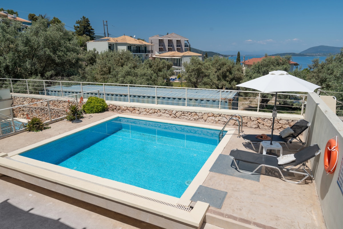 Villa Arion er en del af Diodati Villas, et fredfyldt tilflugtssted på en bakke med panoramaudsigt over havet og autentisk, varm gæstfrihed. Den er ideel til par eller familier og har to soveværelser, tre badeværelser, et fuldt udstyret køkken og en fantastisk udendørs pool. Det gratis Starlink-wifi er perfekt til fjernarbejde og forbindelse. Nyd den private pool, liggestole, lounge, udendørsbruser, grill og det skyggefulde spiseområde. Uforglemmelige afslappende øjeblikke, badet i den græske sol, med udsigt over Det Ioniske Hav.