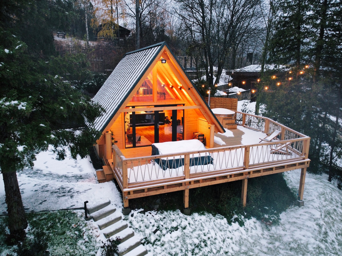 Huset er en klassisk A-rammehytte (alpine tag), der er genovervejet og skræddersyet til dine moderne behov. Kæmpe vinduer og lyse områder omfavner hytten med et "hyggeligt" soveværelse, der gør hytten moderne og intim på én gang. Der er også en rummelig gårdhave med træpaneler, hvor du kan solbade eller sidde på et tæppe og sippe en varm drink, afhængigt af vejret. Der er også en pæn jacuzzi, så du kan lade op!