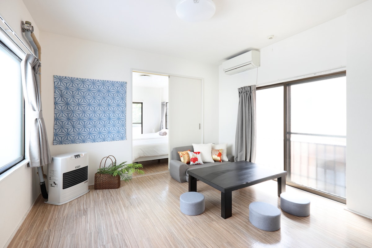 Det er en 123 m² stor terrassesuite med træterrasse ved siden af Aomori Culture Hall. Der er 2 soveværelser med 2 semidobbeltsenge (kingsize) og 2 soveværelser med futoner, så der kan overnatte op til 9 voksne. Babyer er gratis, og det 46 m² store køkken og opholdsrum er fuldt udstyret med et komplet køkken, 3 IH-komfurer og et stort køleskab. 75 tommer 4K stor tv. Højhastighedsinternet, bordtennisbord (fuld størrelse), arbejdsområde, stor vaskemaskine. Der er gratis parkering til 2-3 biler, så det er ideelt til grupper. Perfekt til familieferier med 3 husstande. Der er også babyafskærmning, barnestol og barneseng. 5 minutters gang til Nebuta-området. På den private terrasse kan du nyde eftermiddagste og grill, mens du ser på Hakkoda-bjerget.