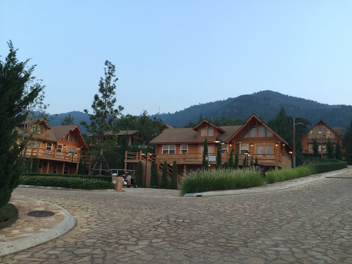 Dette unikke tømmerhus, der er specialbygget med importerede materialer og smagfuldt indrettet med møbler og sengetøj i hyttestil, har en fantastisk udsigt over Khao Yais nationalpark "Big Mountain". Du har fuld adgang til alle sports- og rekreative faciliteter i den eksklusive Toscana Valley Golf & Country Club, såsom swimmingpools, cykelbane, fitnesscenter, legeplads for børn osv.