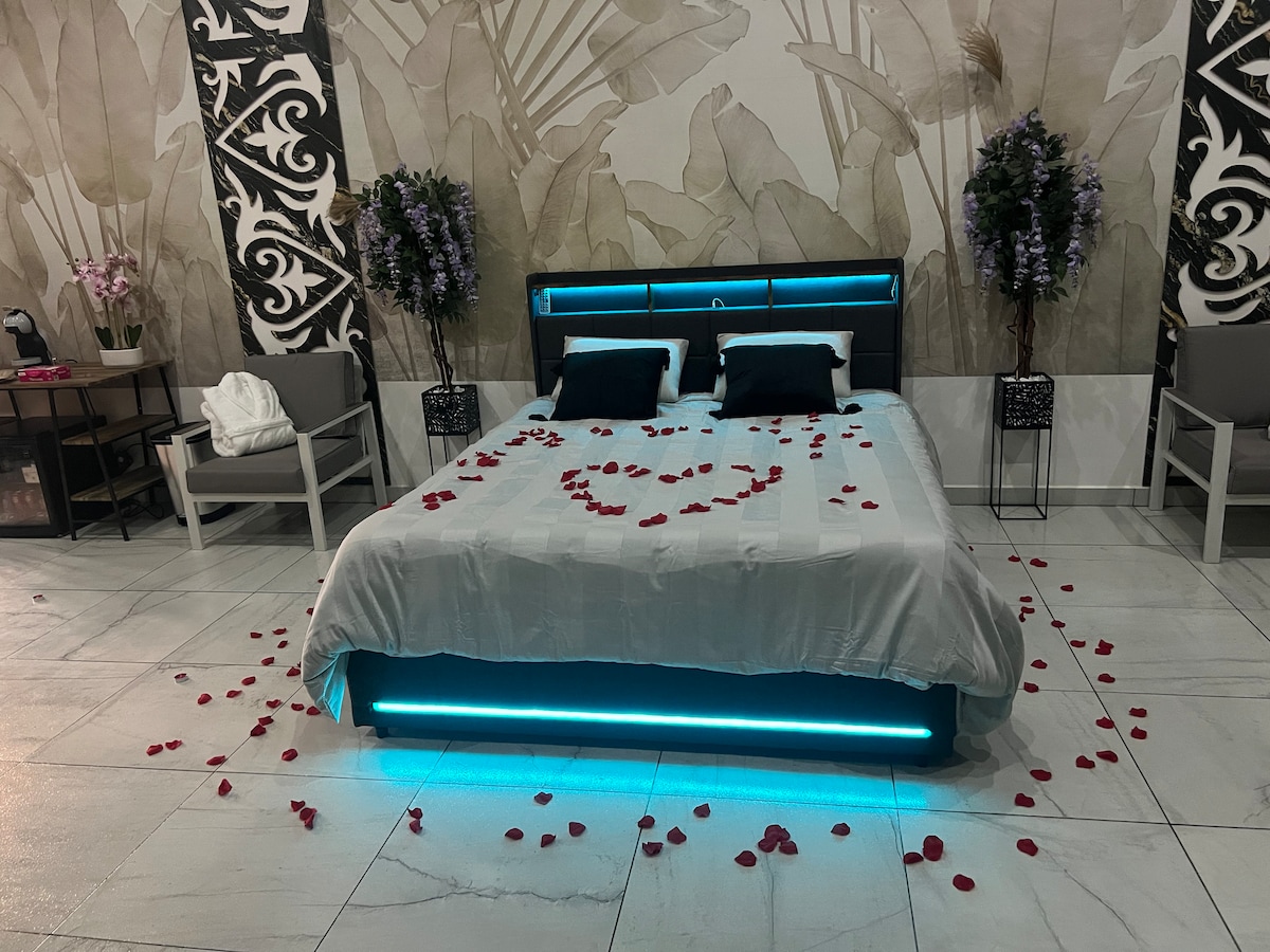 Oplev den hyggelige og romantiske suite, der vækker den romantik, der slumrer i dig. Dette magiske sted er udstyret med en kingsize seng, der giver dig varme og komfort. Mere end blot en nat, lad dig forføre af balneoterapibassinet, en ægte jacuzzi, der vil give dig velvære og lykke. Du vil sætte pris på at tage et brusebad under en regnfuld himmel med dæmpet belysning. Har du lyst til en hyggeøjeblik, så er denne suite værdig til de største hoteller.