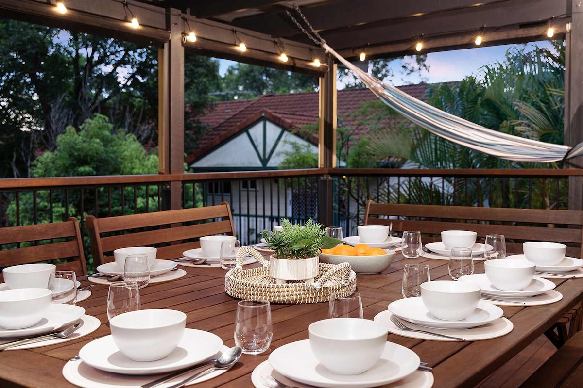 En selvstændig lejlighed i stueetagen i et nyrenoveret 2-etagers hjem - kvalitetsapparater og nye "åh så komfortable" senge! Køkkenet/stuen åbner op til en stor privat, overdækket terrasse med udendørs spisning og fører til poolen. Indgang i stueetagen, ren, rummelig, FANTASTISK beliggenhed! Mindre end 5 minutters gang til CityCat-færgen eller busser og tæt på Bulimbas Oxford Street-restauranter, caféer og butikker. Et færgestop til Bluey's World. (Plads til familie på op til 4+ barneseng) Gratis Wi-Fi - Netflix - Stan