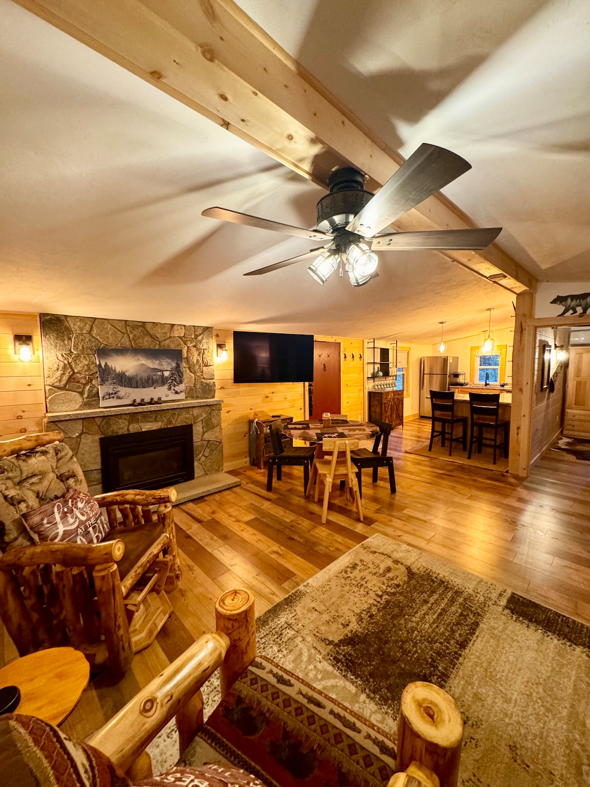 Velkommen til vores hyggelige A-hytte med 3 soveværelser, der ligger i hjertet af North Conway. Denne A-ramme, der oprindeligt blev bygget af vores bedsteforældre i 1960'erne, fungerer som den perfekte hjemmebase til eventyr og udforskning af alt, hvad de hvide bjerge har at tilbyde; skiløb, snesko, snescootere, vandreture, cykling, bryggerier, spisning, flydende Saco, bladkiggeri og lignende!