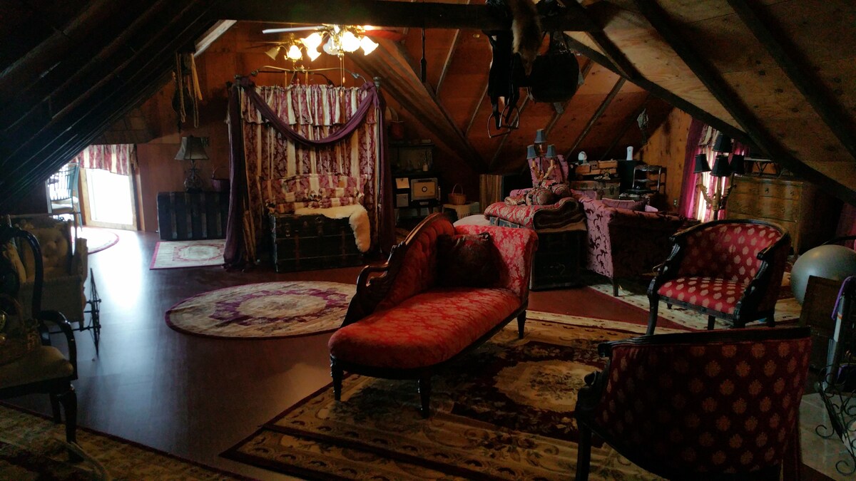 The Penthouse Jacuzzi Suite says it all. The entire 1000 sq ft top floor adorned rustic jewel tones, including quintessential Victorian feature of the turret peak. Amenities include a Queen canopy bed, Parlor Stove (usually used with candles for safety), and an attached open arrangement to pedestal sink and clawfoot jacuzzi tub. Enjoy the Victorian's common areas and easy access to Langdon's downtown shops and restaurants as Bed & Breakfast at Tiffany's is only two blocks from downtown Langdon.