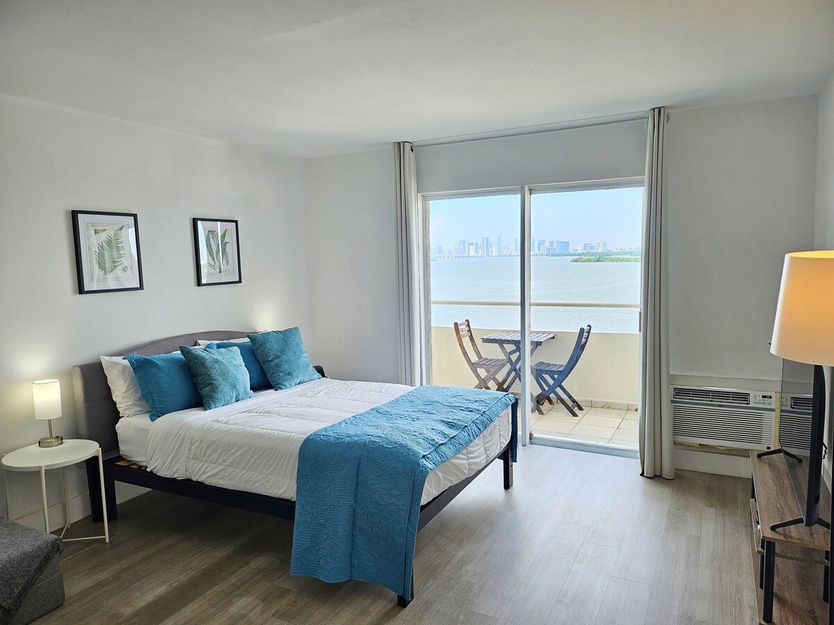 Renoveret studiolejlighed med balkon til 2 personer med fantastisk udsigt. 1 queensize-dobbeltseng. Fuldt udstyret køkken med køleskab, mikrobølgeovn, kaffemaskine, ovn, service, paraplyer og meget mere. 1 komplet badeværelse. Gratis parkering, tøjvask mod et ekstra gebyr. Ideel til dem, der rejser for fornøjelse eller arbejde. 15 minutter med Uber fra Miami Beach, 5 minutter fra stranden, 20 minutter fra den internationale lufthavn og de mest berømte indkøbscentre Intet resortgebyr, engangsregistrering på 15 USD per gæst. Pool midlertidigt ude af drift