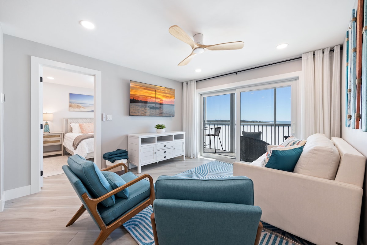 Udsigt over stranden og bugten ved Estero Beach & Tennis Club 206C Vågn op til uhindret udsigt over bugten i denne 5-stjernede lejlighed i Fort Myers Beach! Nyd tidlig indtjekning, ingen udtjekningsopgaver og al komfort – fra en kæmpe GhostBed, fuldt udstyret køkken med opvaskemaskine, gratis højhastigheds-wifi, opvarmet pool, tennis-/pickleballbaner, grill, gratis parkering og strandudstyr. Et par skridt fra sandet med solnedgange, du aldrig vil glemme.