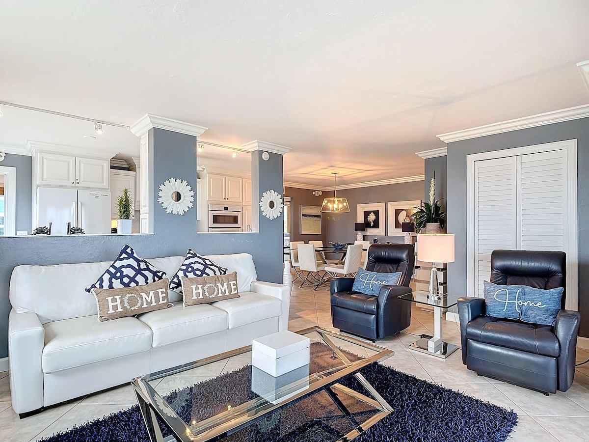 Slap af med hele familien på denne fredfyldte beliggenhed. Vores lejlighed ligger i kvarteret Naples Cay og vil tage dig med ind i Napolis charme og spænding - hovedstaden for happy hours og livemusik! Vores rummelige lejlighed er smukt møbleret med topmoderne apparater. Den åbne balkon er højdepunktet i boligen med smuk udsigt over stranden! Hold dig kølig med central aircondition, og slap af komfortabelt med kingsize-senge i BEGGE værelser!