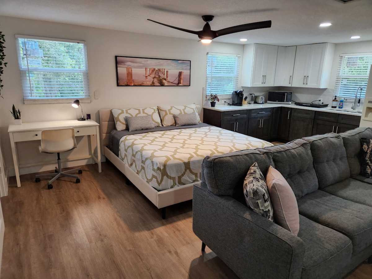 Start din dag med en kop kaffe, mens du ser fuglene og egernene lege i vores stille baggård. Du får en privat indgang og parkeringsplads samt hele atelieret for dig selv. Vi ligger 2,5 miles fra sandet på Venice Beach og 2,5 miles fra rute 75 og downtown Venice. Nyd alle hjemmets faciliteter med Roku TV, højhast internet, queensize seng, køkkenredskaber, strandhåndklæder og stole. En vaskemaskine/tørretumbler kan bestilles ved ophold på 3 dage eller mere.
