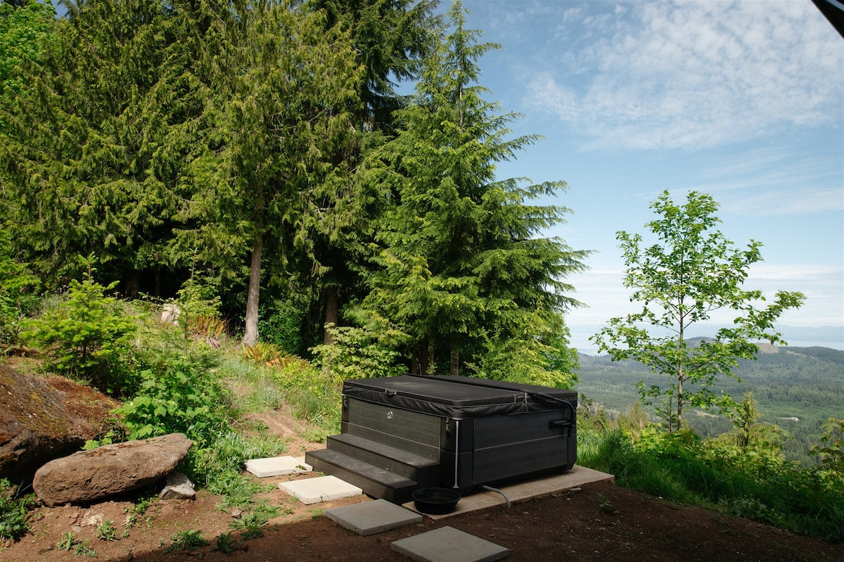 Hytten med spabad og udsigt over solnedgangen på Galiano