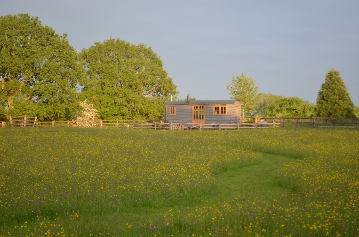 The Oak er vores luksuriøse hyrdehytte, den ligger for sig selv i en ung frugtplantage på vores familiegård. Den er omgivet af smukke landbrugsarealer, hvilket gør opholdet meget fredfyldt. The Oak ligger inden for gåafstand til pubber, butikker og en fantastisk café! Den er gennemført udstyret fra top til bund med gulvvarme, brusebad, kingsize-seng, Netflix osv., ovn, induktionskogeplade, køleskab, kaffemaskine og meget mere. Udenfor er der et brændeopvarmet boblebad og pizzaovn!