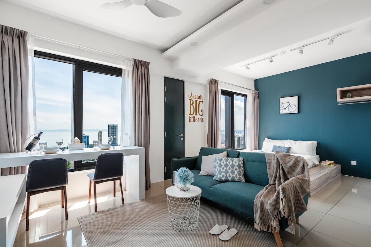 Dette er en ny moderne lejlighed i Tanjung Tokong nær Georgetown. Det er et 41-etagers tårn, der består af virksomhedssuiter med fantastisk havudsigt og F&B-loft. Faciliteterne omfatter en endeløs olympisk pool, Sky fitnesscenter, yoga og Sky Observatory dæk, dedikeret sikker adgang concierge lobby, børnebassin, legefaciliteter, designerlandskaber og orientalsk gårdhave. Vores atelier er beliggende i højt niveau med balkon mod højre til Gurney kystlinje million dollars udsigt.
