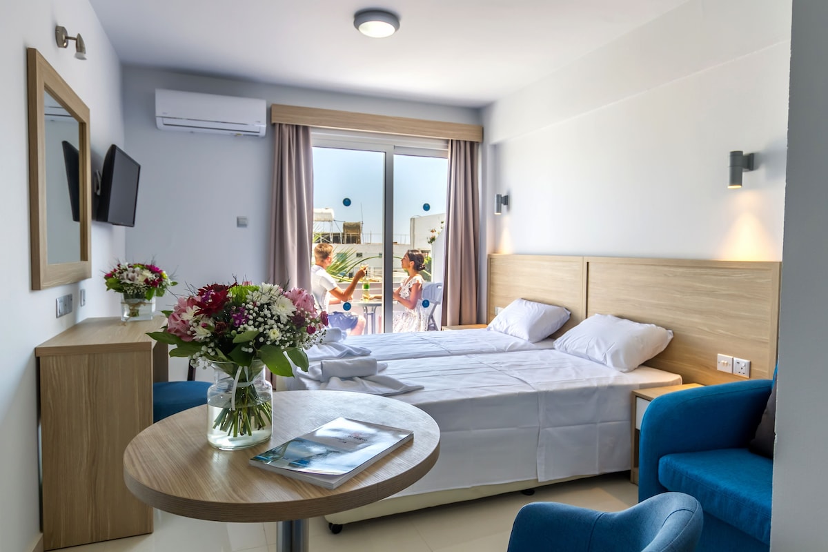Centrally located in Agia Napa, Paul Marie Hotel Apartments are recently renovated offering to our guests comfort and hospitality.The hotel is 300m from the center and the nearest beach is 1km away.The hotel consist of 23 hotel rooms and 28 self-catering apartments all tastefully refurbished.Hotel facilities include a large lobby area with reception,bar and restaurant.Rooftop swimming pool with snack bar serving food and drinks. Wifi is available in all public areas and is free.Parking on spot