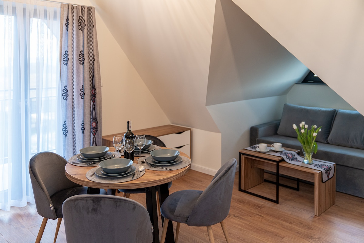 Apartament jest przestrzenny, jasny, funkcjonalny i nowocześnie urządzony, tak aby goście mieli poczucie komfortu, praktyczności i wygodny. Okna skylightowe w 2 sypialniach wprowadzają niezapomniany klimat i nastrój. Apartament jest przewidziany na 4 osoby, nie mniej jednak jego przestrzeń stwarza możliwość dostawki. Goście mają wsparcie ze strony gospodarza z uwagi szybki jego dostęp do apartamentu i reagowanie na potrzeby gości na bieżąco. Kontakt jest telefoniczny/bezpośredni.