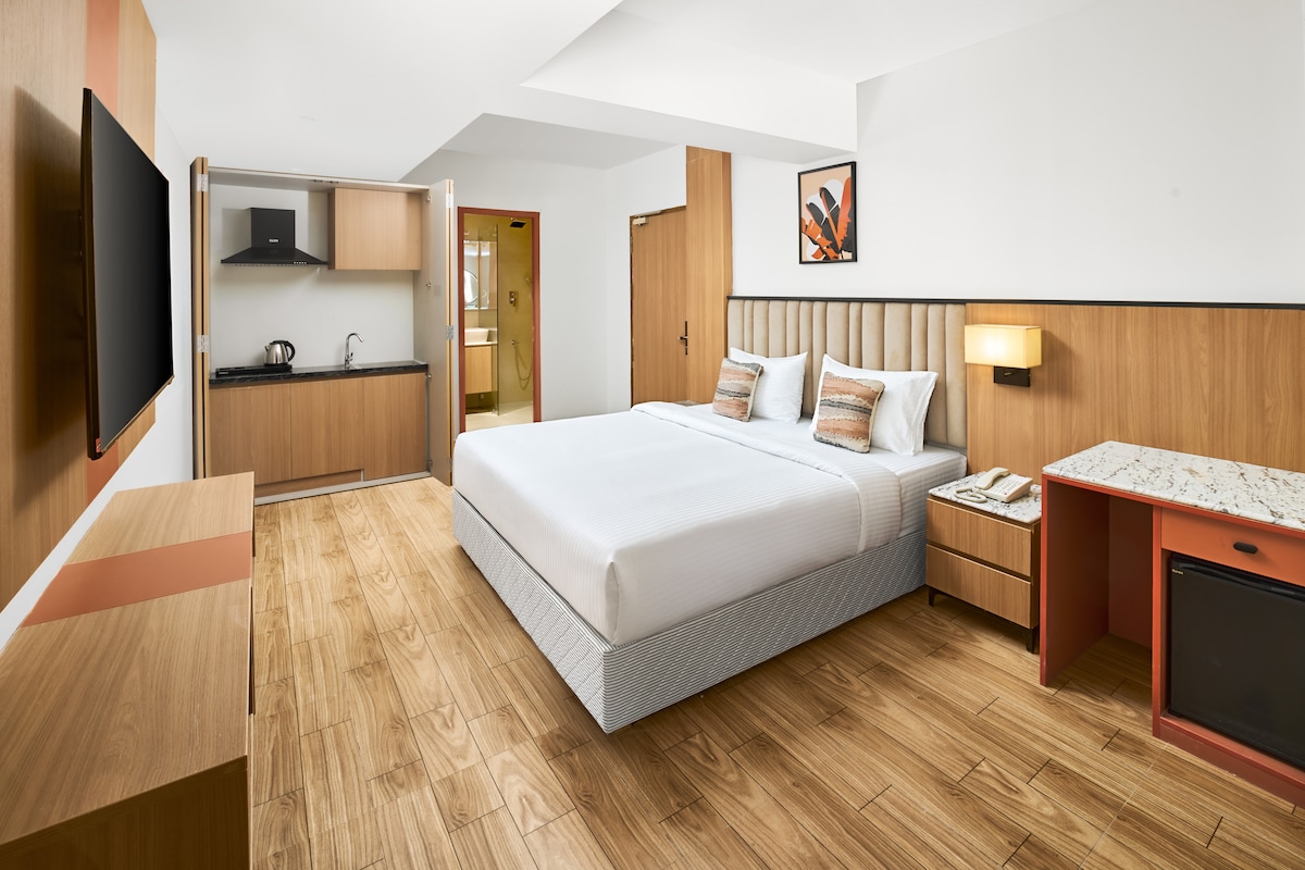 Vores Deluxe-værelse tilbyder et rummeligt og indbydende tilflugtssted, der er perfekt til dem, der søger et strejf af luksus under deres ophold. Med en generøs plads på 160 kvadratfod er dette rum designet til at give maksimal komfort og afslapning. Nyd masser af plads til at bevæge dig rundt og slappe af , synk ned i vores bløde senge for at få en god nats søvn. Oplev bekvemmeligheden ved moderne faciliteter, herunder fladskærms-tv, Wi-Fi, aircondition , værelsesbelysning.
