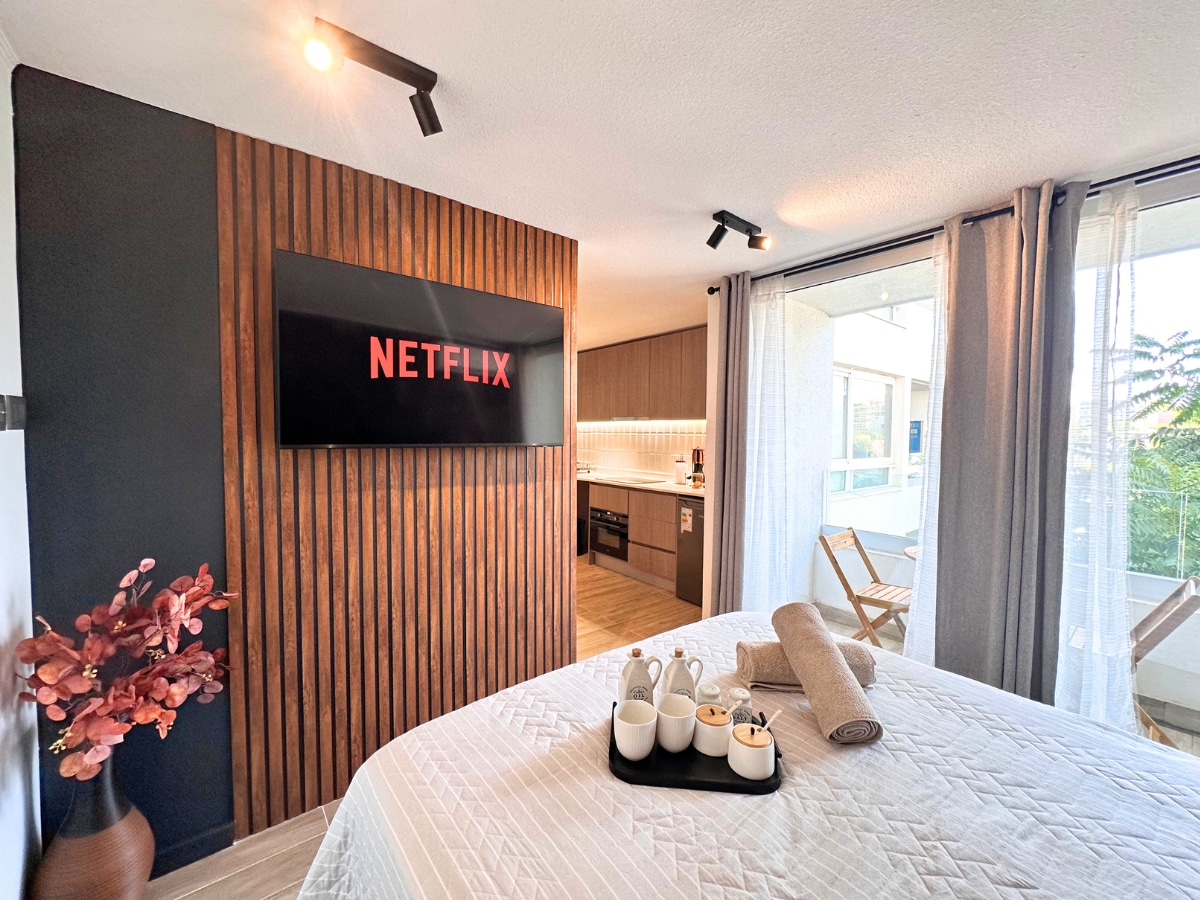 Nyd en moderne, lys og omhyggeligt indrettet lejlighed. Den er fuldt udstyret til komfortable ophold og har en dobbeltseng, sovesofa, integreret køkken, smart-tv, wi-fi og balkon med en klar udsigt. Beliggende i et sikkert og forbundet område i Santiago, ideel til hvile eller arbejde. Et varmt, funktionelt rum med fokus på hver eneste detalje, der får dig til at føle dig hjemme. Fremragende beliggenhed: tæt på Plaza Ñuñoa og Mall Portal Ñuñoa, sportscentre. Med god transport.