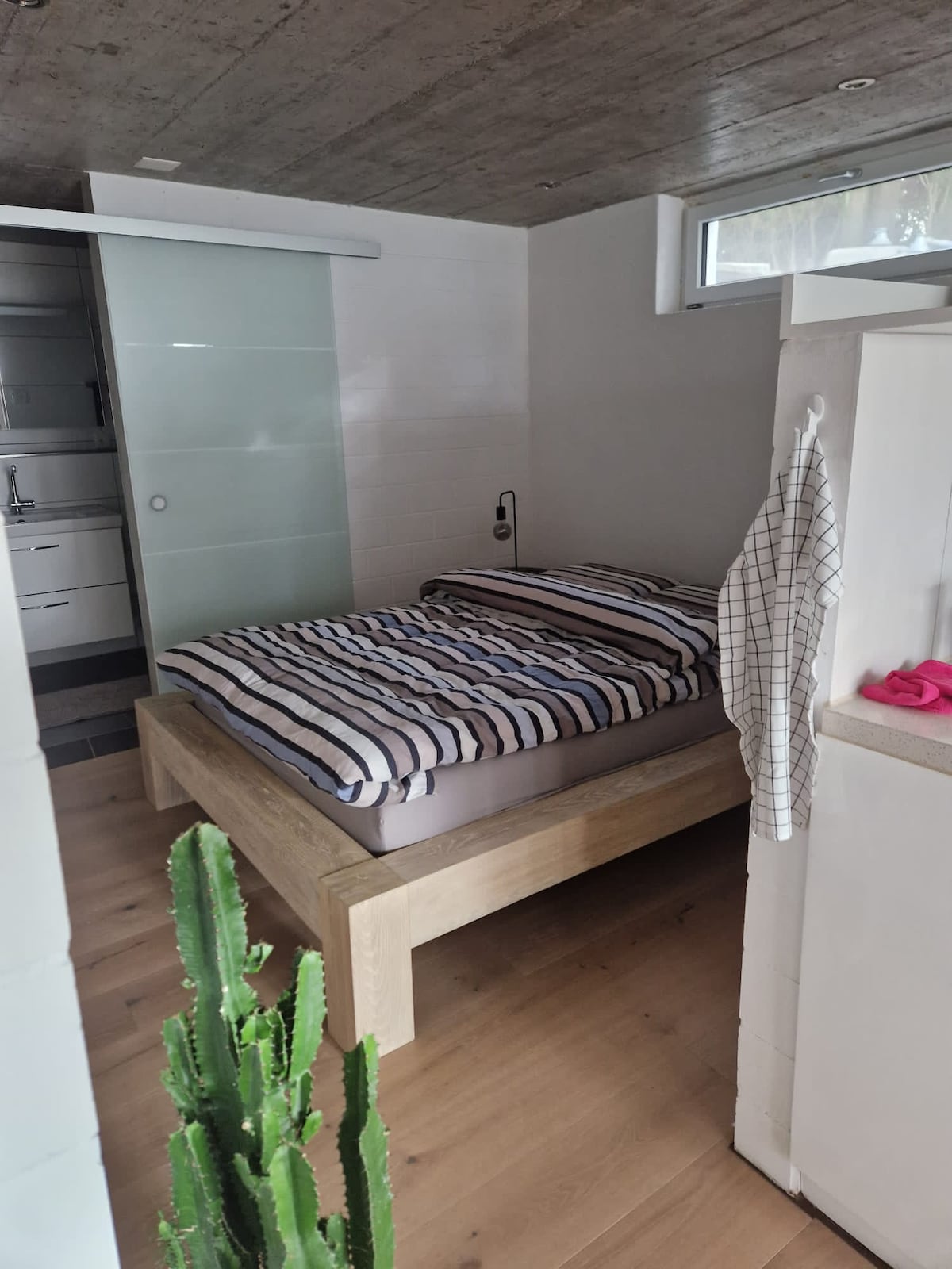Hyggeligt studie i et flerfamiliehus med lille udendørs siddeplads i Ticino-flair. Studiet har et badeværelse, 1,40 m seng, et indbygget skab, et køkken med spisebord og lille opholdsområde. Studiet er ideelt til 1 person (maks. 2) Beliggenhed: På få minutters gang kan du nå centrum af Wettingen eller den nærliggende by Baden. Vigtigt: I lejlighedsbygningen bor Wong (hund). Da indgangen til atelieret er i haven, vil du helt sikkert møde Wong.