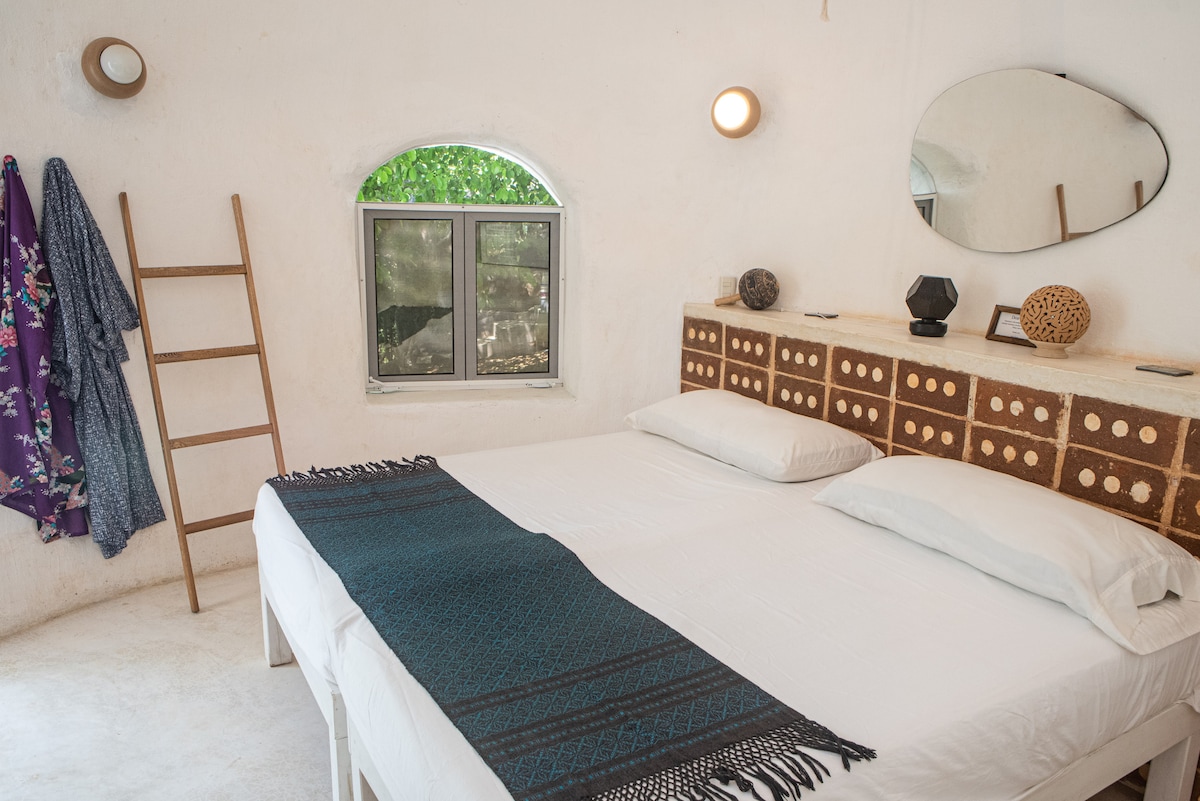 Isoler dig selv i et 2,5 hektar skjult permakulturparadis i vores SuperAdobe-bungalower. 3 minutters gang til en tom strand med inspirerende udsigt. 100% solenergi. Hurtig Wifi overalt. Stor svømning @ Roca Blanca 1 mil væk. 30 min kørsel til Chacahua National Park, Bioluminescent Laguna og Hot Springs. Hver halvdel kan udlejes separat tjek profil for andre opslag. #NoKids# WildlifeWatching#PermaGlamping#OffGridLuxury# InstagramEnvy#CyberHomesteading# DigitalNomads#BitcoinsAccepted