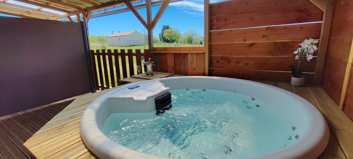 Chaletten (50 m2) er ideel til et par med små børn. ✅Isoleret fra andre bygninger ✅Med udsigt til legepladsen ✅Aircondition ✅Privat udendørsområde med havemøbler og grill ✅ Adgang til den opvarmede pool og spa (fra midten af april til slutningen af september, afhængigt af vejret, fra kl. 10.30 til 20.00) ⚠️ deles med gæsterne i vores andre hytter ✅Anlagt park med spil ✅Hunde og katte er velkomne ➡️ Vores ejendom "Le Jardin d'Eden" i Valojoulx består af 6 hytter fra 2 til 8 personer, maks. kapacitet 23 personer