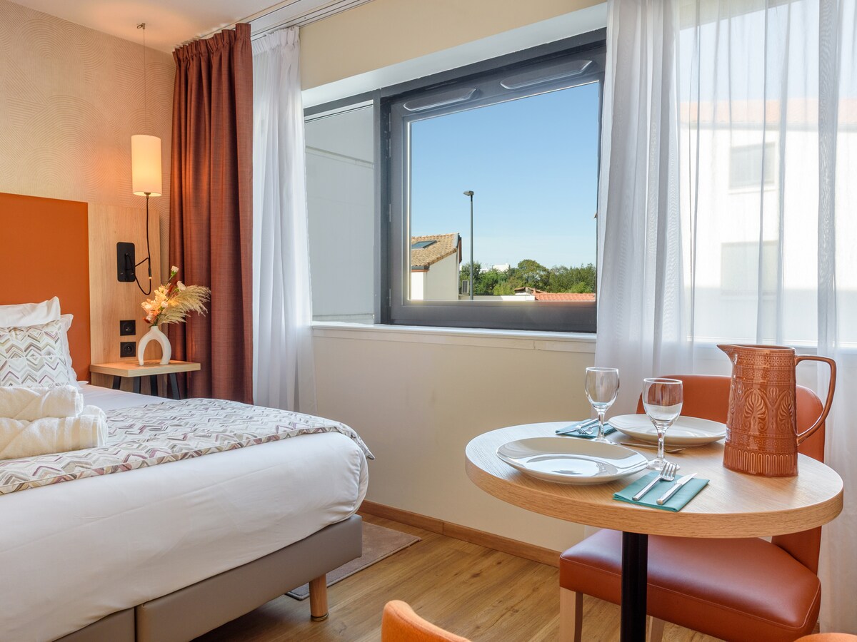 Residhome Tolosa lejlighedshotel er beliggende mellem Blagnac internationale lufthavn og det historiske centrum, overfor Purpan hospital, og i nærheden af et indkøbscenter. Det har direkte adgang til erhvervslivet, luftfart, sundhed, og universitet distrikter via ringvejen. Studiet omfatter: en stue med seng, et kontorområde med en direkte telefonlinje, et fuldt udstyret køkken (glas keramisk komfur, køleskab, mikrobølgeovn, retter...), et badeværelse, et fladskærms-tv.