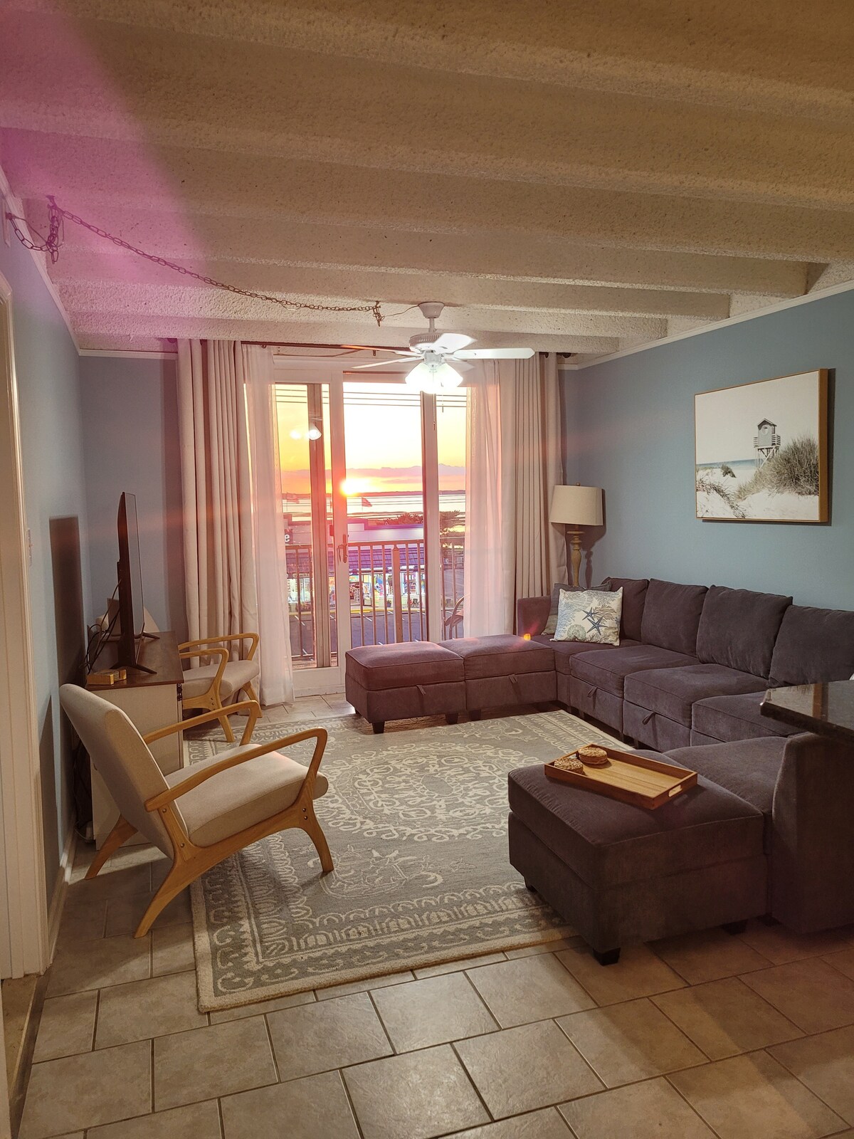 Surprisingly spacious 3rd floor studio with beautiful sunset views from the private, covered back deck, overlooking tidal lagoon. Vaulted ceiling with skylight. Building has an elevator. Within easy walking distance to several amazing Bars/ restaurants and 2 short blocks to the beach/boardwalk just a five minute walk. Next to Jolly Roger Amusement/Waterpark. You can truly just park your car and forget about it! Ocean view from front deck. Foot shower across from elevator to wash sand off.