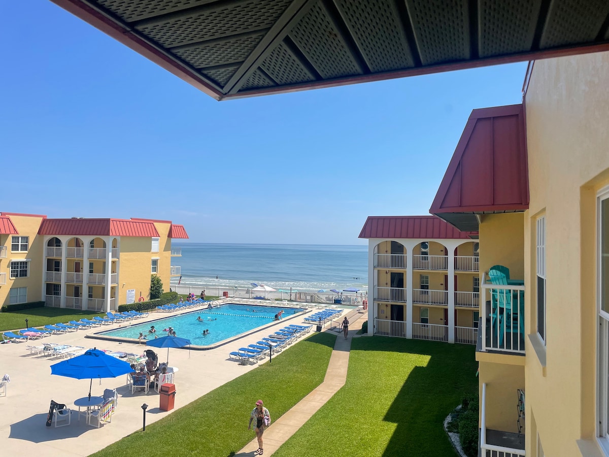 Den perfekte ferie beliggende på stranden! Nyd at høre bølgerne fra denne afslappende lejlighed med en spektakulær havudsigt. 1 kingsize-dobbeltseng og privat balkon, som du kan nyde. Lejligheden har et opdateret køkken og badeværelse. Wi-fi og kabel-tv, vaskeri på stedet og gratis privat parkering. Du vil også nyde den store udendørs pool i dette vidunderlige kompleks ved havet! Lige i hjertet af Daytona, alt inden for gåafstand til restauranter, barer, shopping og rekreation.