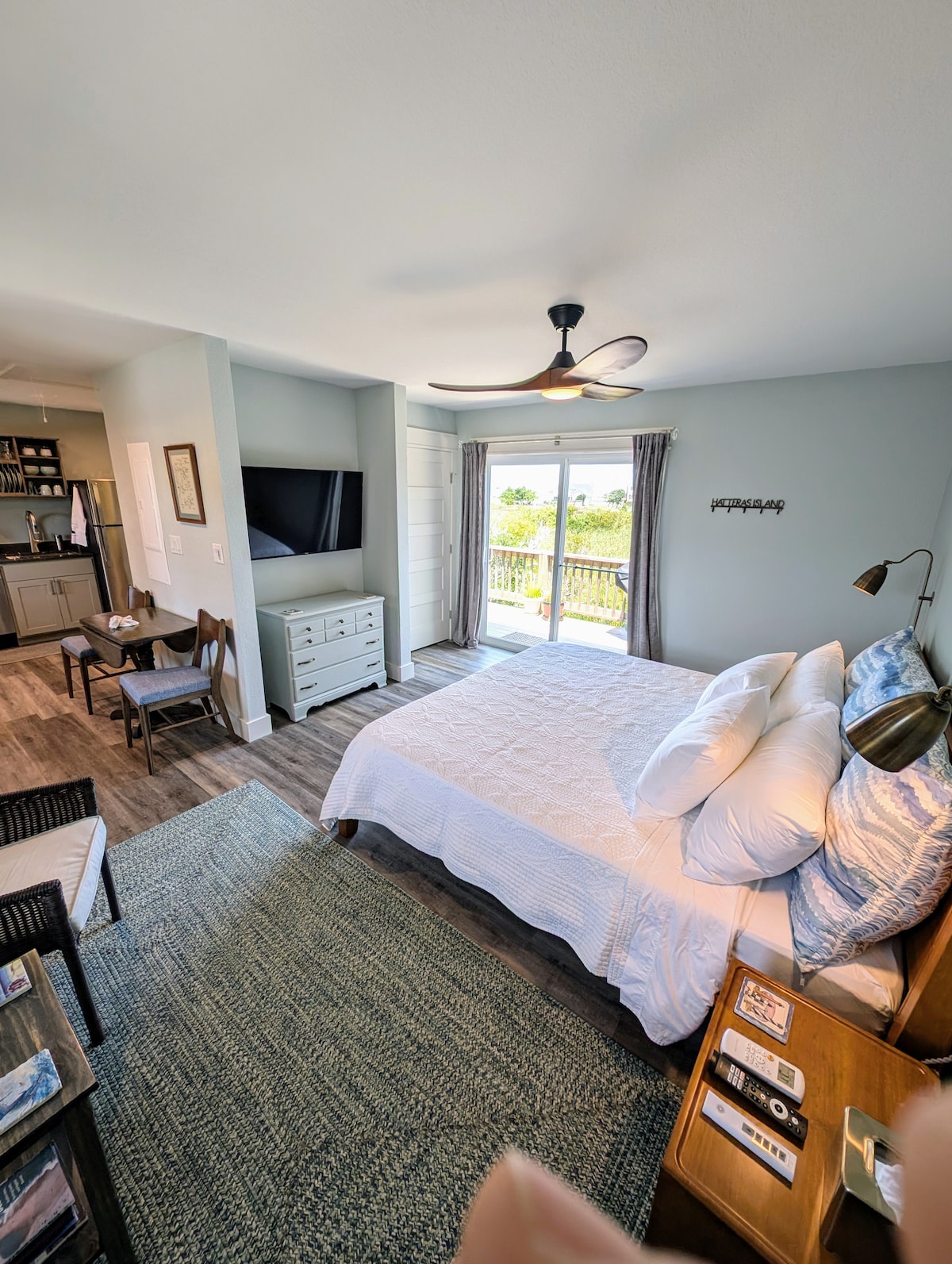 Vores garagesuite er to værelser med strand- og surfingtema. Vi har en fritliggende garage, og suiten er bagved, adskilt fra huset med egen indgang. Der er en queensize-dobbeltseng, tiki-bar og tekøkken. Du vil være afskåret med masser af cedertræer og bambus omkring en privat terrasse. Vores sted ligger i hjertet af Ocracoke med restauranter og butikker inden for gå- eller cykelafstand. Ocracoke Lighthouse & Springers Point Nature Preserve ligger 5-8 minutters gang væk.