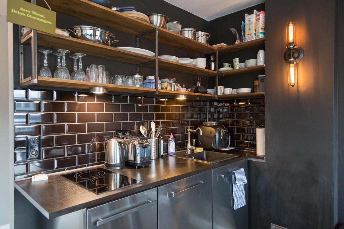Solrig, eksklusiv 1-værelses lejlighed i Køln centrum til 1-2 personer; åbent plan, gulvvarme, komfortabel seng (1,40 x 2 m), stilfuldt opholdsområde, køkken, indbyggede møbler af høj kvalitet; moderne badeværelsesdesign med dagslys/eksklusive møbler; højhastigheds WiFi op til 100 mbit/sek; udførligt belysningsdesign 3 minutter til shoppinggaderne, restauranter og barer lige uden for døren, 800 meter til katedralen, motorvej A57 med bil på 5 minutter. Bookinger på 90 dage eller mere på anmodning.