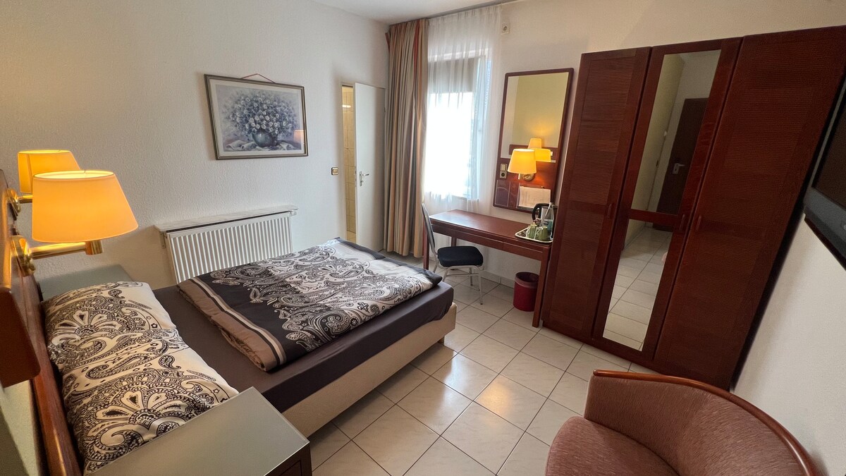 Hotel som værelse med komfortabel dobbeltseng (1.40mx2.00m). Hurtig adgang til metrolinjer (S-Bahn), autobahn, lufthavn, messe og to bycentre (Frankfurt & Offenbach).