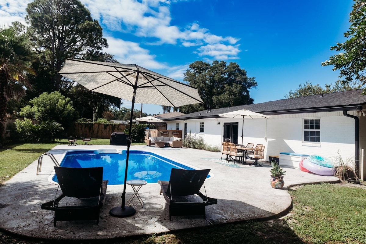 Velkommen til din perfekte ferie, kun 5 minutter fra stranden, med shopping og spisning ved havet lige uden for døren. Slap af i denne charmerende strandby, der er perfekt til underholdning med en udendørs terrasse udstyret med grill, tv og bålplads. Udforsk Fort Walton Beachs livlige shoppingmiljø, forkæl dig selv med lokale smagsvarianter på nærliggende restauranter, nyd nattelivet, når det bliver mørkt, og vend tilbage for at slappe af med stil. Alt, hvad du har brug for, er lige ved hånden. Book nu for en uforglemmelig kystferie.