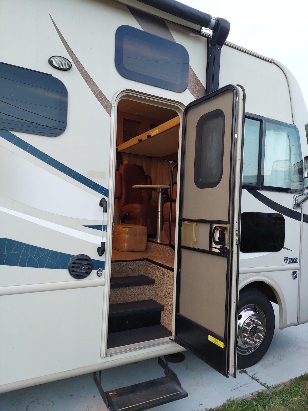 Kun for familieferiegæster, minimumsalder: 27 år for at leje – sommer-, efterårs- og vintersæson. Denne luksuriøse autocamper fra 2016 af Thor A.C.E. er alt andet end almindelig! Din Air hotel RV. (Ikke til leje til kørsel eller flytning til et andet sted). Den har 2 fulde xL-senge og 1 udtræksseng. Alle nye lædersæder 2022, fuld elektrisk og propangas til opvarmning af vand og til varme. Komfortable siddepladser og sengetøj. Fuldt udstyret med gaskomfur, top/bund køleskab, bruser, opbevaring og meget rummelig - 30' ft lang.